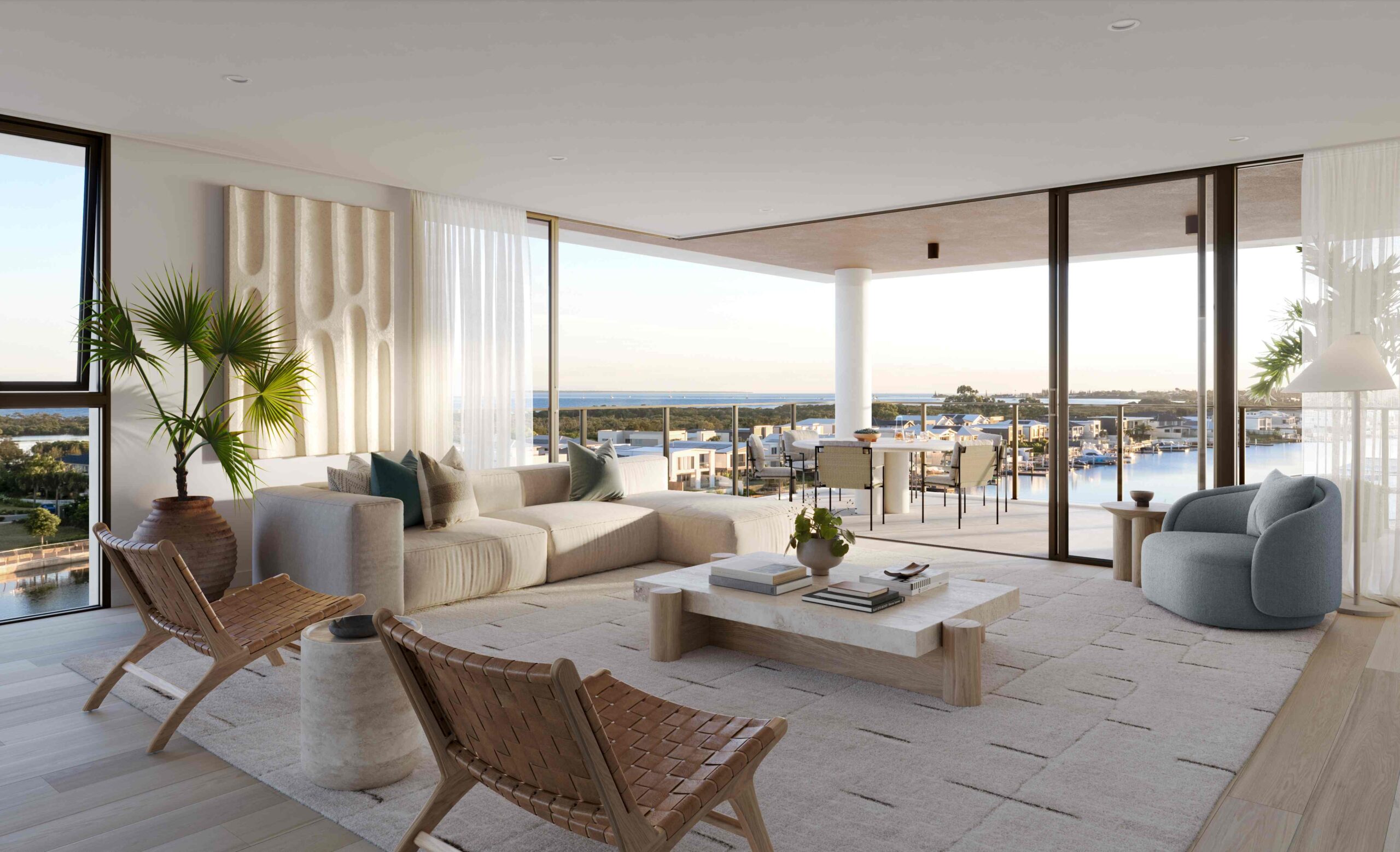 Lighthouse has two buildings, Palm and Dune, connected by a subtropical porte cochere entry. The development comprises 133 diverse dwellings including two and three-bedroom apartments and penthouses, three-bedroom garden villas and three-bedroom townhomes across 6 levels. Resident amenities at Lighthouse include a series of garden lobbies, airy walkways, swimming pool for each building, outdoor entertaining areas, landscaped gardens, shared residents lounge and a 22-berth Marina frontage.